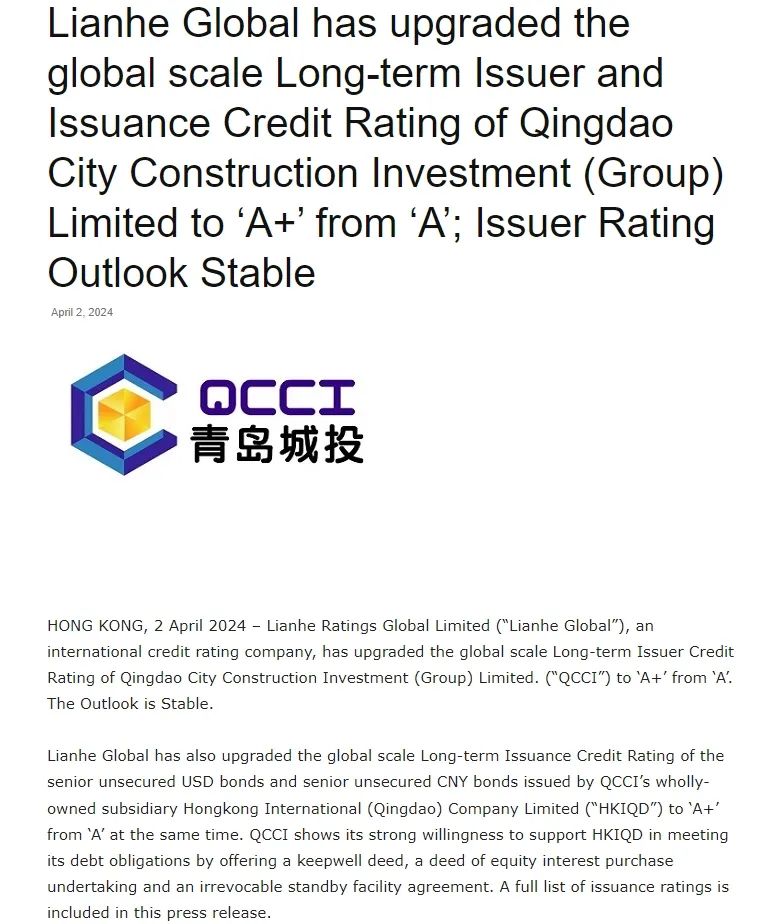4月2日,,,,,,,,权威评级机构团结国际正式宣布上调青岛William希尔官网入口集团国际恒久刊行人评级从‘A’上调至‘A+’,,,,,,,,展望稳固,,,,,,,,同时将由青岛William希尔官网入口全资子公司香港国际(青岛)有限公司(“香港国际”)刊行的高级无典质美元债券和高级无典质人民币债券的国际恒久刊行债务评级从‘A’上调至‘A+’。。。。。。