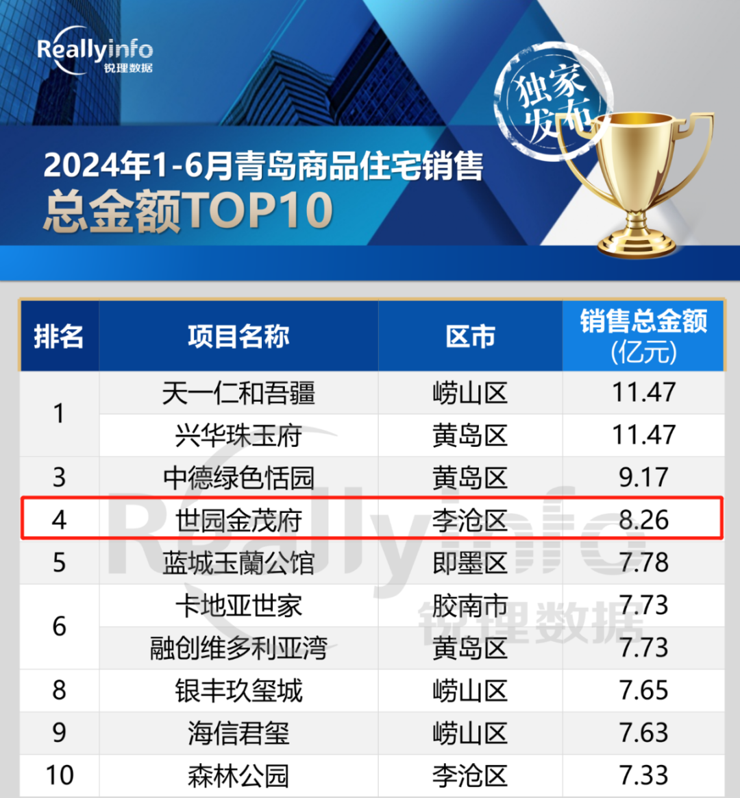 克日,,,,,,,,锐理数据宣布“青岛房市年中榜”,,,,,,,,青岛William希尔官网入口集团世园·金茂府以8.26亿销售总金额荣登青岛市2024上半年网签金额第四名,,,,,,,,稳居李沧区第一名。。。。。