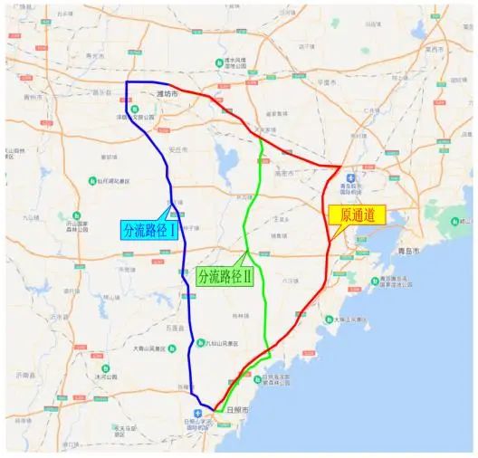 潍坊-青岛分流路径。。。。。使用青银高速、潍青高速、潍日高速、青兰高速作为潍坊至青岛的分流路径。。。。。
