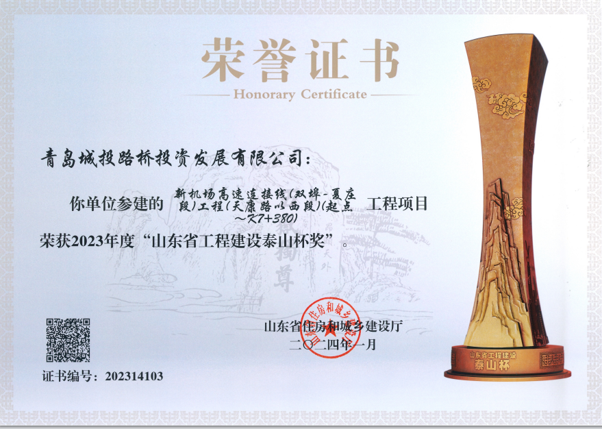 新机场毗连线工程被山东省住房和城乡建设厅授予“2023年度山东省工程建设泰山杯”声誉。。。。。。