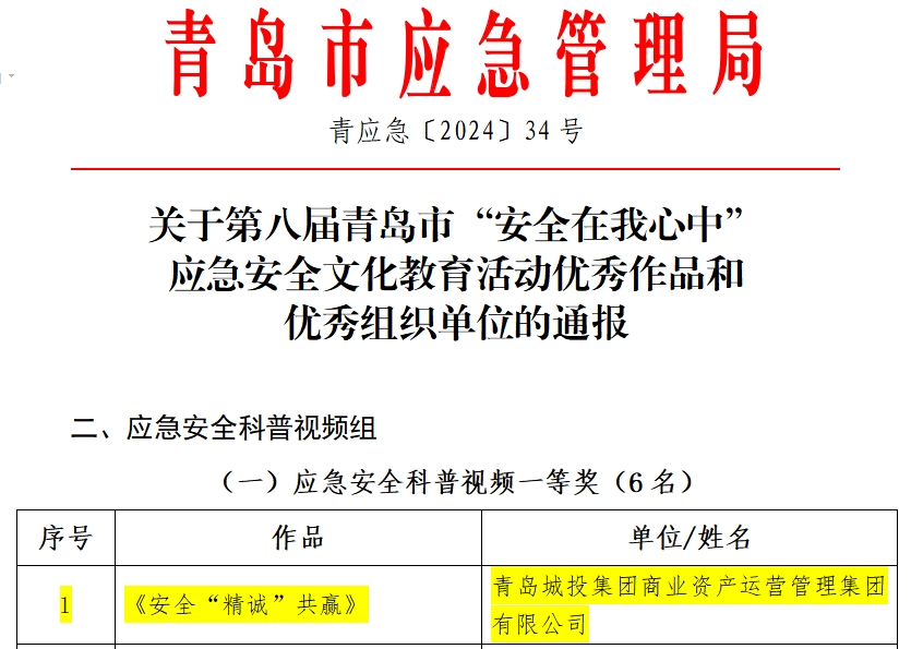 商管集团荣获第八届青岛市“清静在我心中”应急清静文化教育运动中荣获应急清静科普视频一等奖。。。。。。
