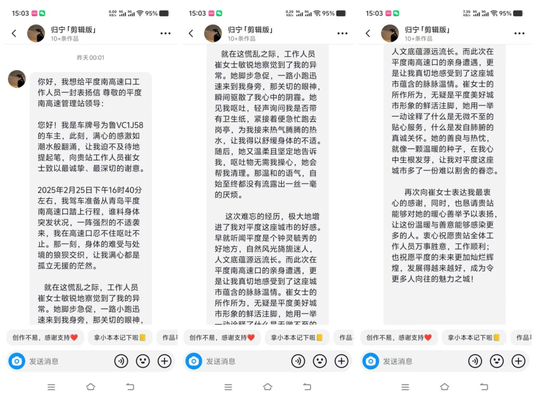 克日,,,,,,一封通过抖音私信辗转转达的谢谢信,,,,,,让青岛William希尔官网入口集团旗下青岛高速集团平度收费站收费班长崔倨扑鹉暖心故事走入公众视野。 。 。。。。。平度市文旅局官方账号收到司乘职员特殊致谢,,,,,,信中纪录的温情时刻,,,,,,成为展现都会文明与青岛高速服务品质的生动缩影。 。 。。。。。