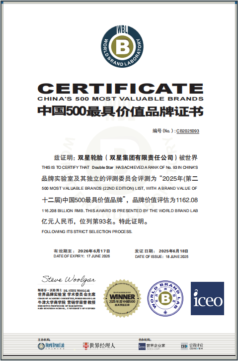 双星集团坚持全工业链的科技立异、人才和机制立异,,,,,,,,成为全球第一个全工业链自循环的轮胎企业。。。。。。。2024年,,,,,,,,双星盈利在2023年三位数增添的基础上又实现了三位数增添。。。。。。。双星集团以创天下一流企业为目的,,,,,,,,将立异作为品牌内在,,,,,,,,一连提升品牌影响力。。。。。。。2024年,,,,,,,,“双星轮胎”品牌成为中国首个价值超千亿的轮胎品牌,,,,,,,,并一连多年荣登“亚洲品牌500强”中国轮胎榜首、“C-BPI中国国产汽车轮胎行业品牌力第一名”,,,,,,,,获得行业与用户的认可。。。。。。。
