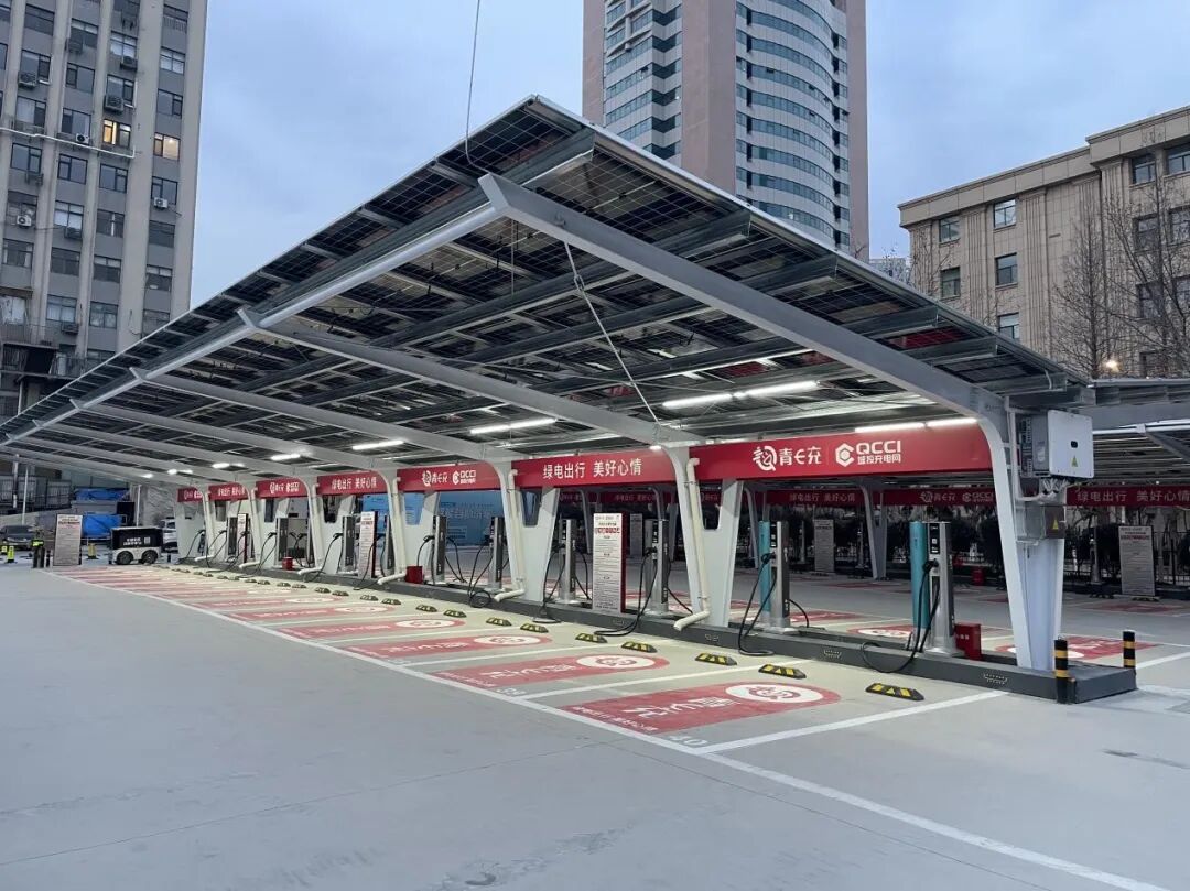 下昼三点,,,,,,,青岛市南区延安三路充电站,,,,,,,一辆辆新能源车有序排队补能。。。。。车来车往,,,,,,,充电桩灯光闪灼。。。。。