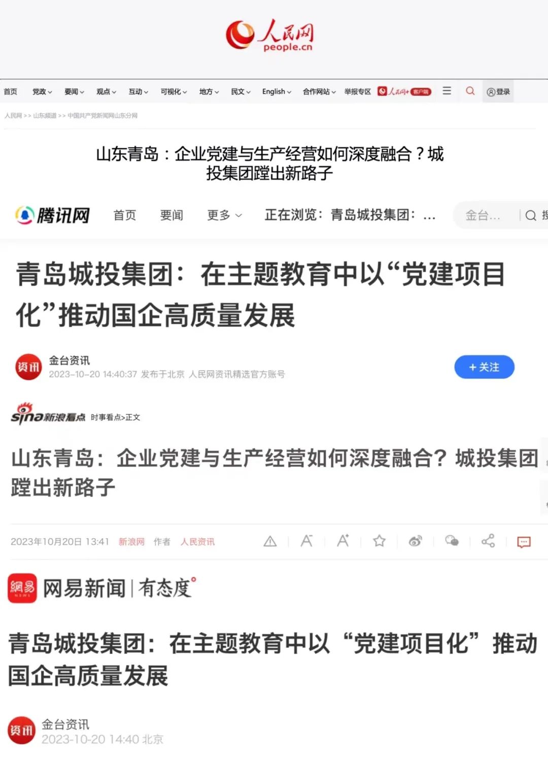 10月20日,,,,,,人民日报旗下人民网在中国共产党新闻网、人民网港澳台版、金台资讯、腾讯网、网易新闻、新浪网等着名媒体平台集中报道了《在主题教育中以“党建项目化”推动国企高质量生长》《企业党建与生产谋划怎样深度融合????????William希尔官网入口集团蹚出新路子》两篇文章16次。。。。。。青岛William希尔官网入口集团“党建项目化”的立异做法,,,,,,为国有企业破解党建谋划“两张皮”难题给出“William希尔官网入口谜底”,,,,,,在互联网引发热烈回声。。。。。。