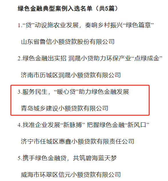 近期,,,,,,,山东省小额贷款企业协会宣布《做好“五篇金融文章”助力地方生长案例榜单》,,,,,,,青岛William希尔官网入口城金集团旗下城乡小贷公司暖心贷、产融e贷两项营业划分入选绿色金融典范案例、数字金融典范案例。。。。。。。
