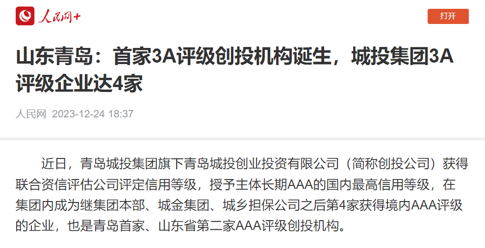 人民网:山东青岛首家AAA评级创投契构降生,,,,,,William希尔官网入口集团3A主体评级企业达4家