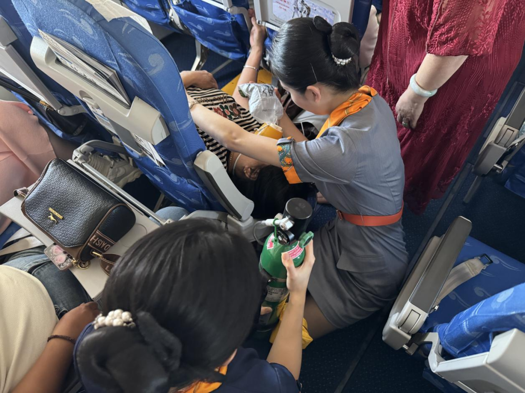 当日航班餐饮服务历程中,,,,,,,,乘务员孙博姝发明12B座游客面色惨白、大汗淋漓、呼吸难题,,,,,,,,意识模糊,,,,,,,,连忙将此情形报告乘务长,,,,,,,,并为游客送上温水。。。。。。乘务长徐赞向偕行眷属相识得知,,,,,,,,该游客患有十年心脏病史,,,,,,,,刚刚服用了其随身携带的速效救心丸。。。。。。情形紧迫之下,,,,,,,,乘务长连忙启动紧迫医疗救护程序:安排乘务员陪同照顾、报告机长并广播寻找医生、资助患病游客替换到空座上平躺、开启氧气瓶为游客提供吸氧......全体机组成员分工明确、通力配合,,,,,,,,在万米高空为游客的生命保驾护航。。。。。。