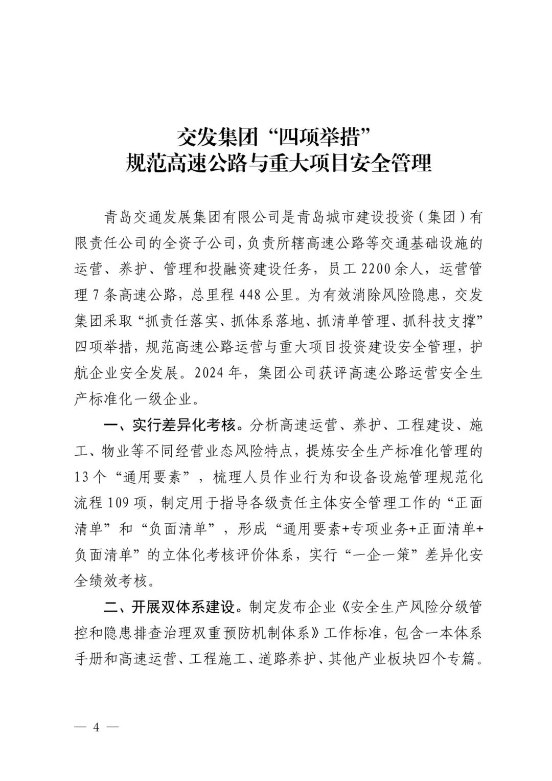 为深入推进国家、省市和青岛William希尔官网入口集团清静生产治本攻坚三年行动及事情要求,,,,,健全完善清静管理系统建设,,,,,夯实清静管理基础,,,,,实现高速公路运营与投资建设清静重大事故隐患动态清零,,,,,青岛William希尔官网入口集团旗下交发集团驻足现实,,,,,制订施行“抓责任落实、抓系统落地、抓清单管理、抓科技支持”四项行动,,,,,优异履历做法被市安委办《应急管理事情简报》(清静生产治本攻坚三年行动专刊)第13期刊发推广。。。。。。。